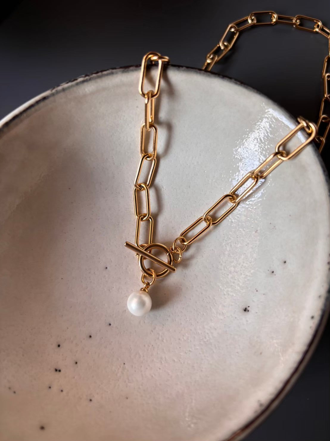The gold-plated chain is paired with round freshwater pearls, making this necklace stand out yet versatile.