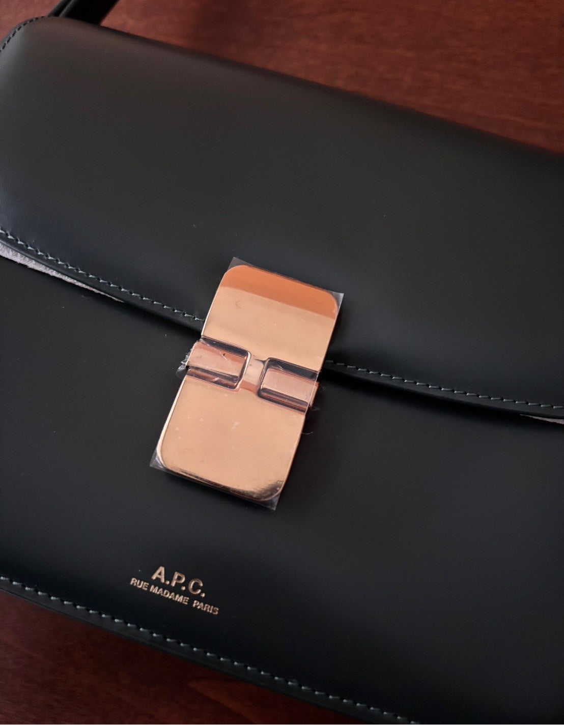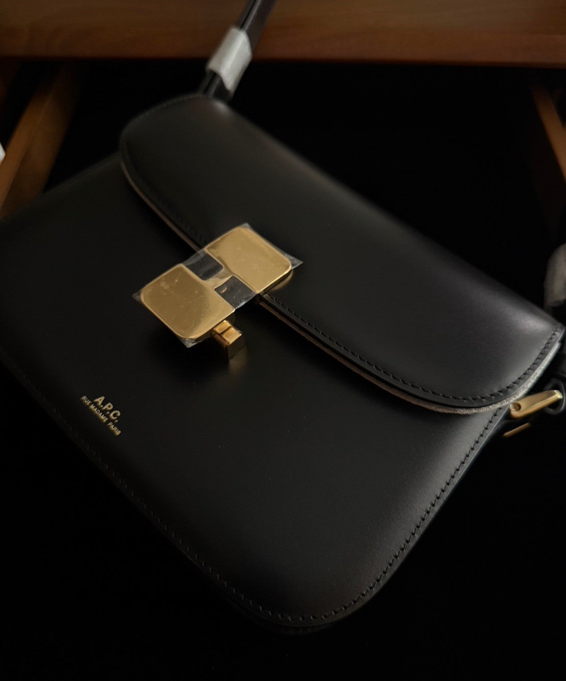 正面飾有「A.P.C. Rue Madame Paris」金色標誌燙印,搭配金色帶釦,翻蓋下有麂皮絨面革襯裡。為可調式肩帶,可肩背或斜背在胸前。